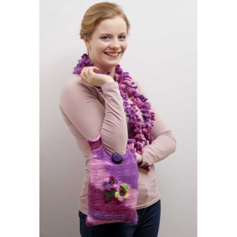 Liz Bag - A stunning set ideal for Pub knitting project. An attractive knitted lined bag decorated with crocheted flowers for all ages with a coordinating twistie scarf. Very easy detailed instructions. Suitable for Beginner or experienced knitter alike.